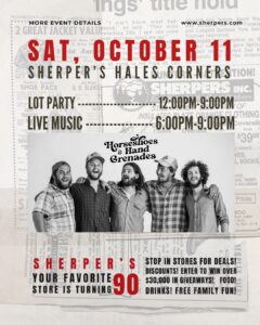 We’re doing two FREE SHOWS in the greater Brew City area on October 11th and October 12th! Sherper’s is a family owned and operated Wisconsin outdoor business and they’re celebrating 90 years by throwing a couple of big ol’ block parties at their stores. These are family friendly shows with bags tournaments and beer and a couple sets of HHG